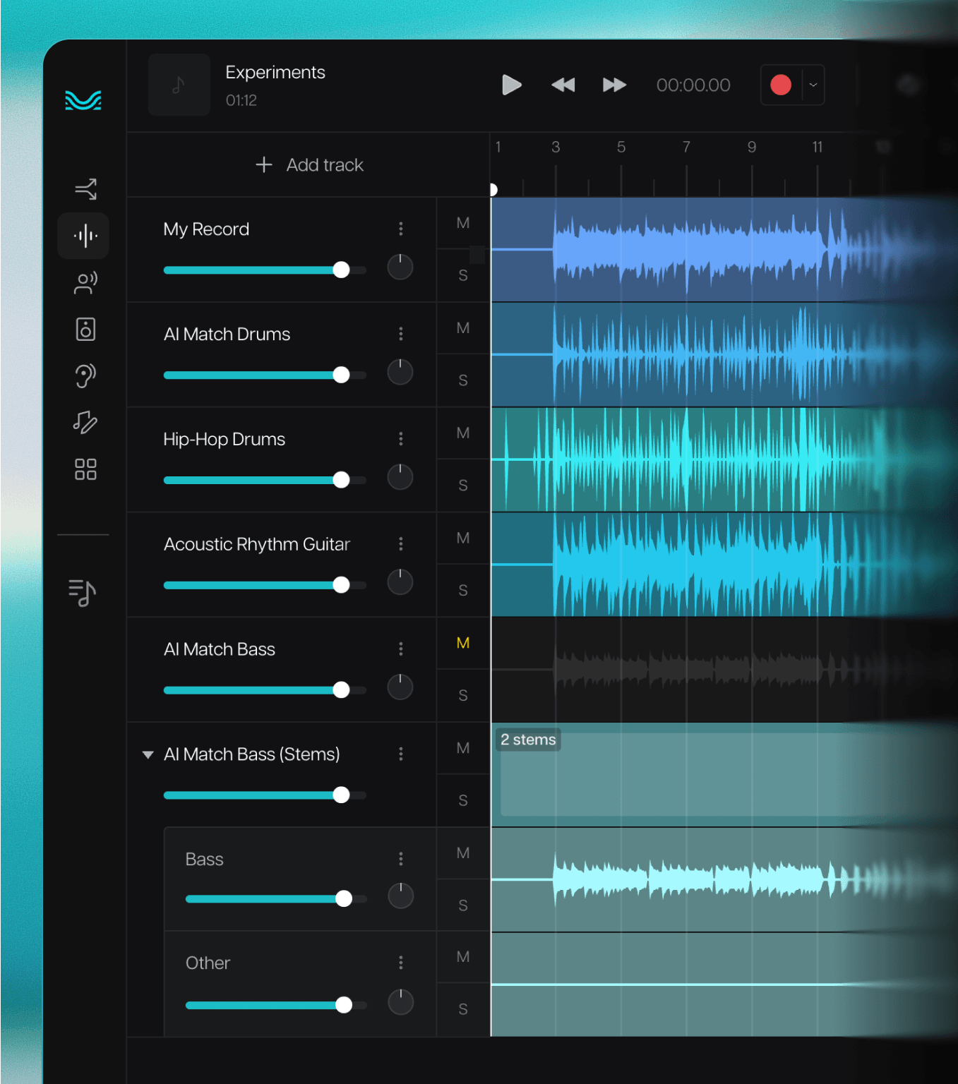 Whether your idea starts with a guitar riff or a bassline, AI Studio helps shape it into a full arrangement. Generate new layers and test variations without breaking your flow.