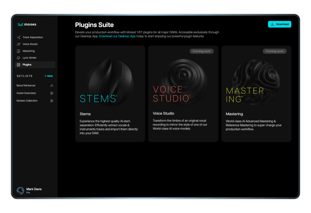 Logged into your Moises account with a Pro Subscription via Desktop App, click “Plugins” on the sidebar. Download the Stems plugin, available for MacOS or Windows.