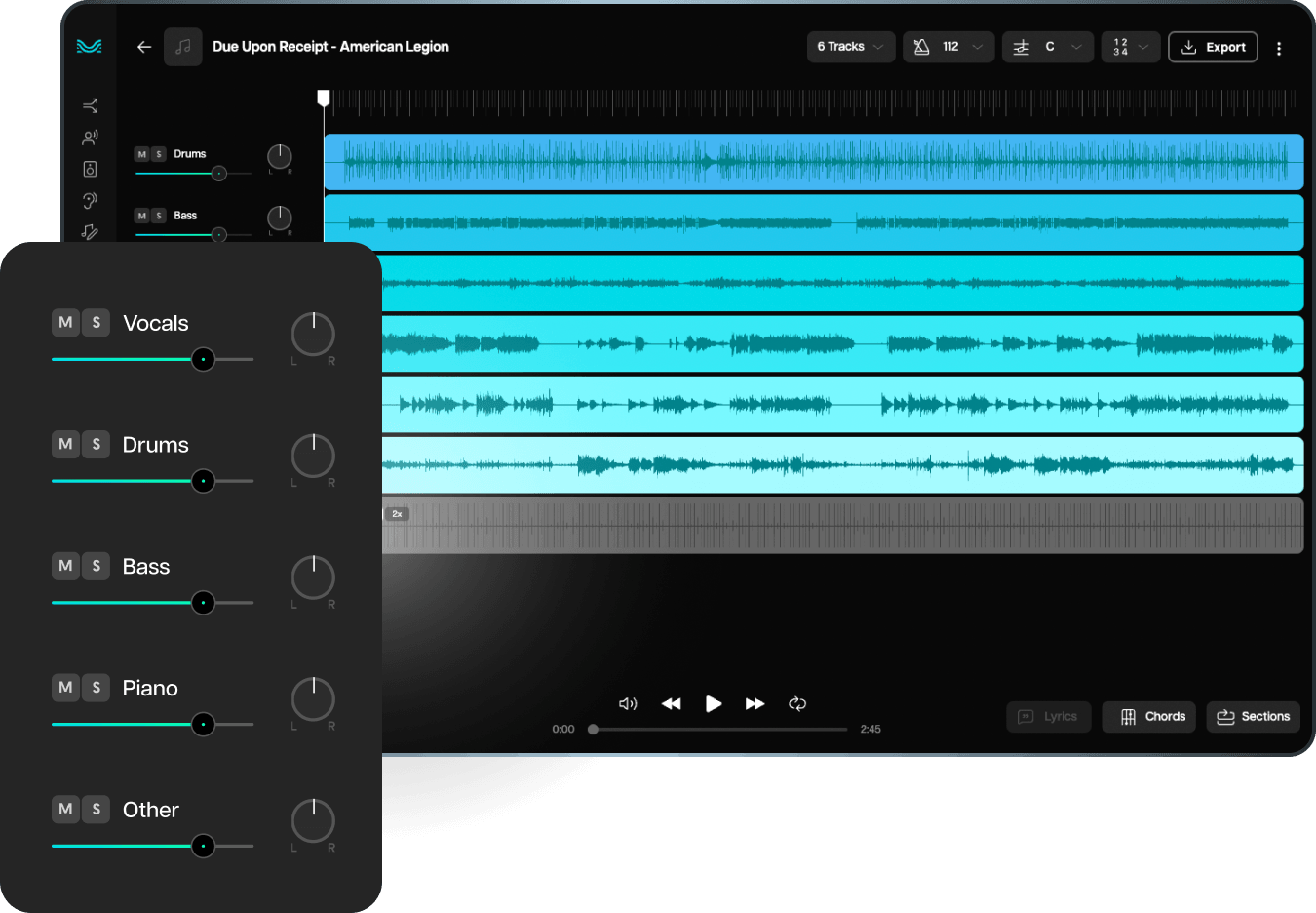 Harness Moises’ cutting-edge AI Audio Separation to isolate up to 23 distinct instruments, including detailed elements like lead, rhythm, and acoustic guitars, and individual drum kit components.