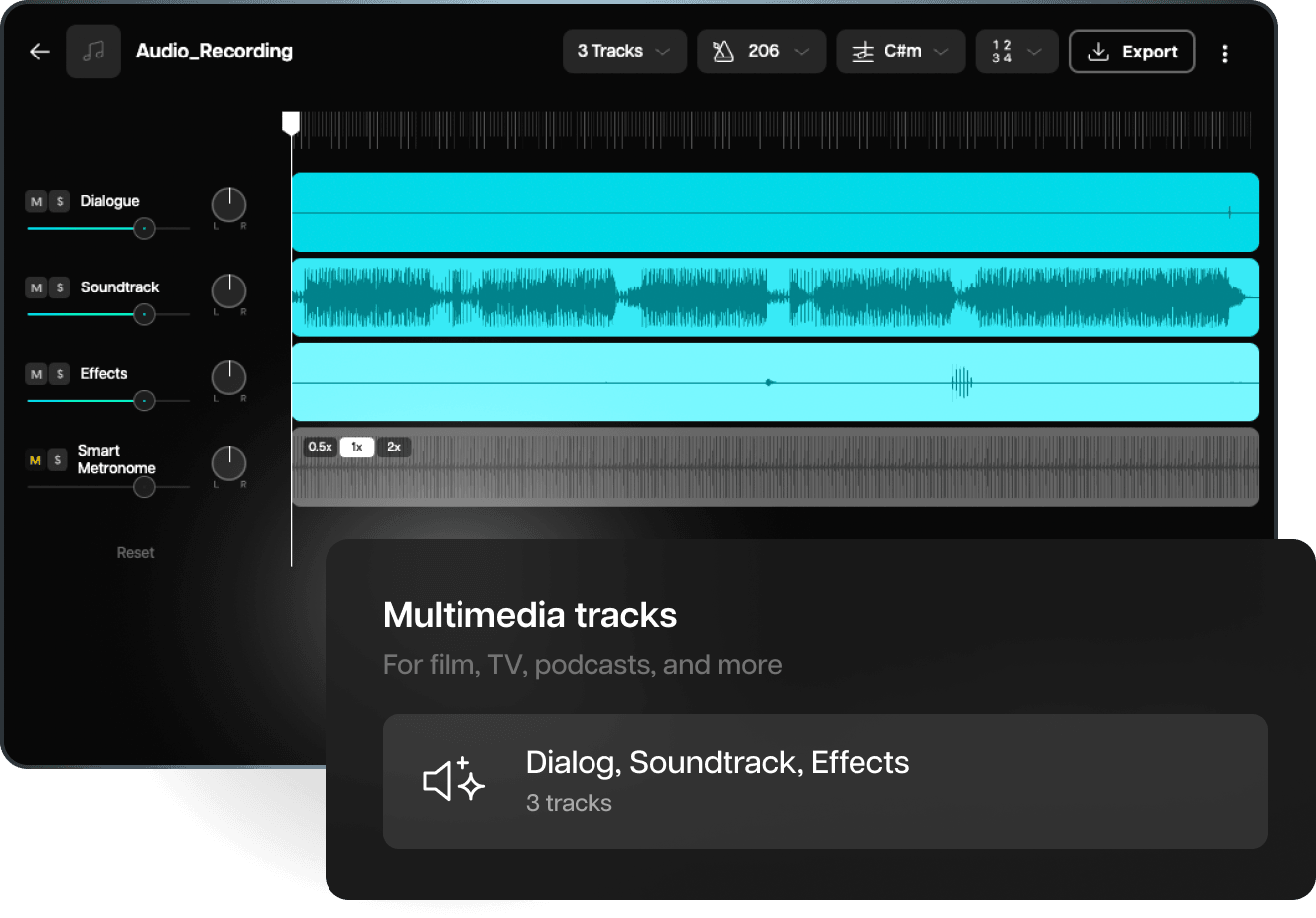 Designed to separate audio into Dialogue, Soundtrack, and Effects with unmatched precision, the Multimedia Tracks separation model is perfect for film, TV, podcasts, and more. Save valuable editing time and enhance the overall quality of your projects.